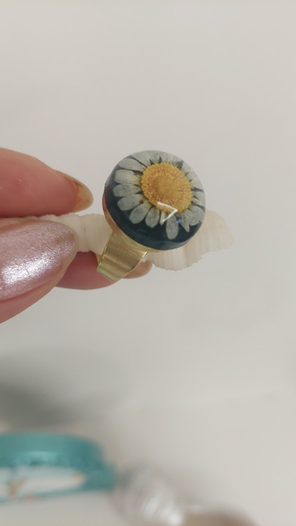 انگشتر رزینی با گل طبیعی بابونه و تزئینات عالی، نمادی از پاکی است. طراحی مینیمال این کار با هر استایلی ست میشود.