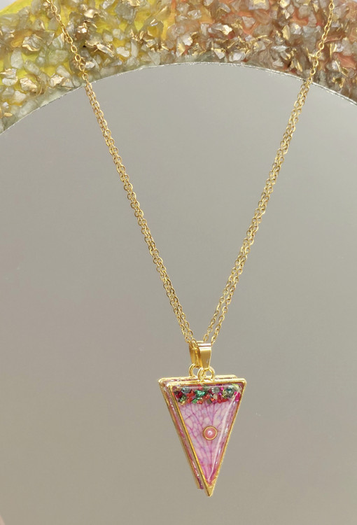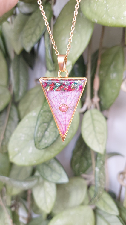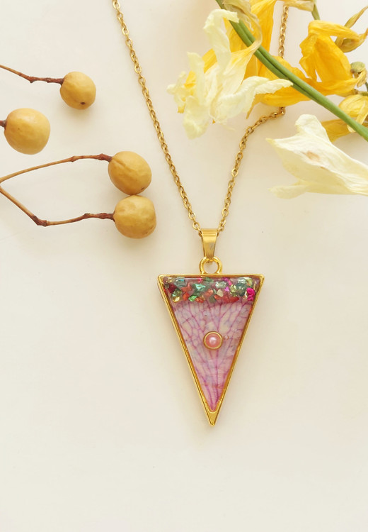 این گردنبند خاص با گلبرگهای طبیعی رز هلندی و تزئینات عالی ساخته شده است. رنگ سرخ گلبرگها در کنار شفافیت رزین، جلوهای رمانتیک دارد.