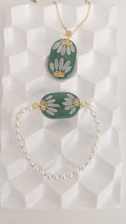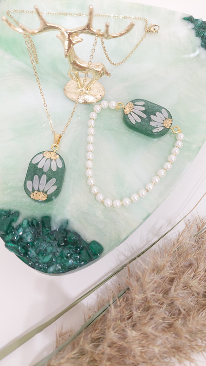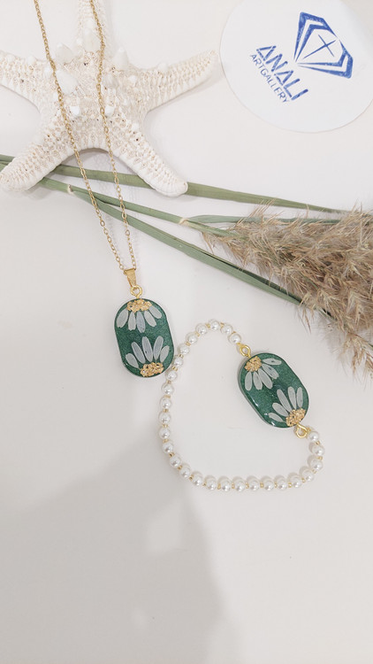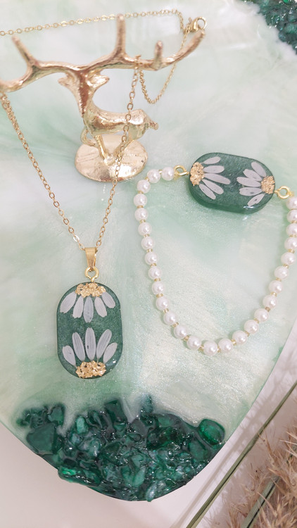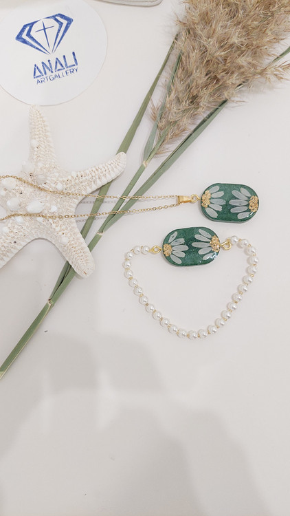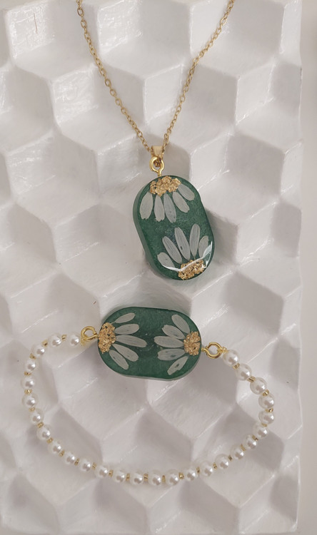 این نیمست شامل گردنبند و گوشواره با گلهای طبیعی بابونه و تزئینات عالی است. هماهنگی بینظیر این ست، هدیهای کامل و چشمگیر برای عزیزانتان خواهد بود.
