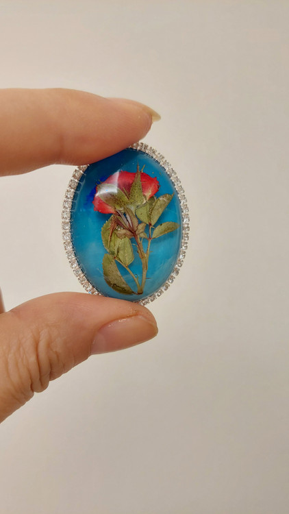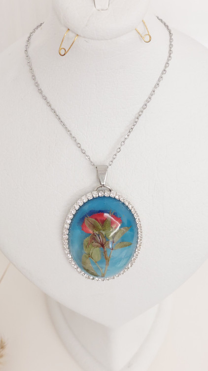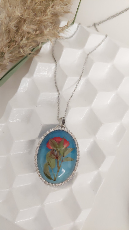 این گردنبند محدب، یک گل رز مینیاتوری طبیعی را در آغوش گرفته است. شفافیت رزین باعث شده تا تمام جزئیات گلبرگها به زیبایی دیده شوند و حسی از عشق جاودان را منتقل کنند.